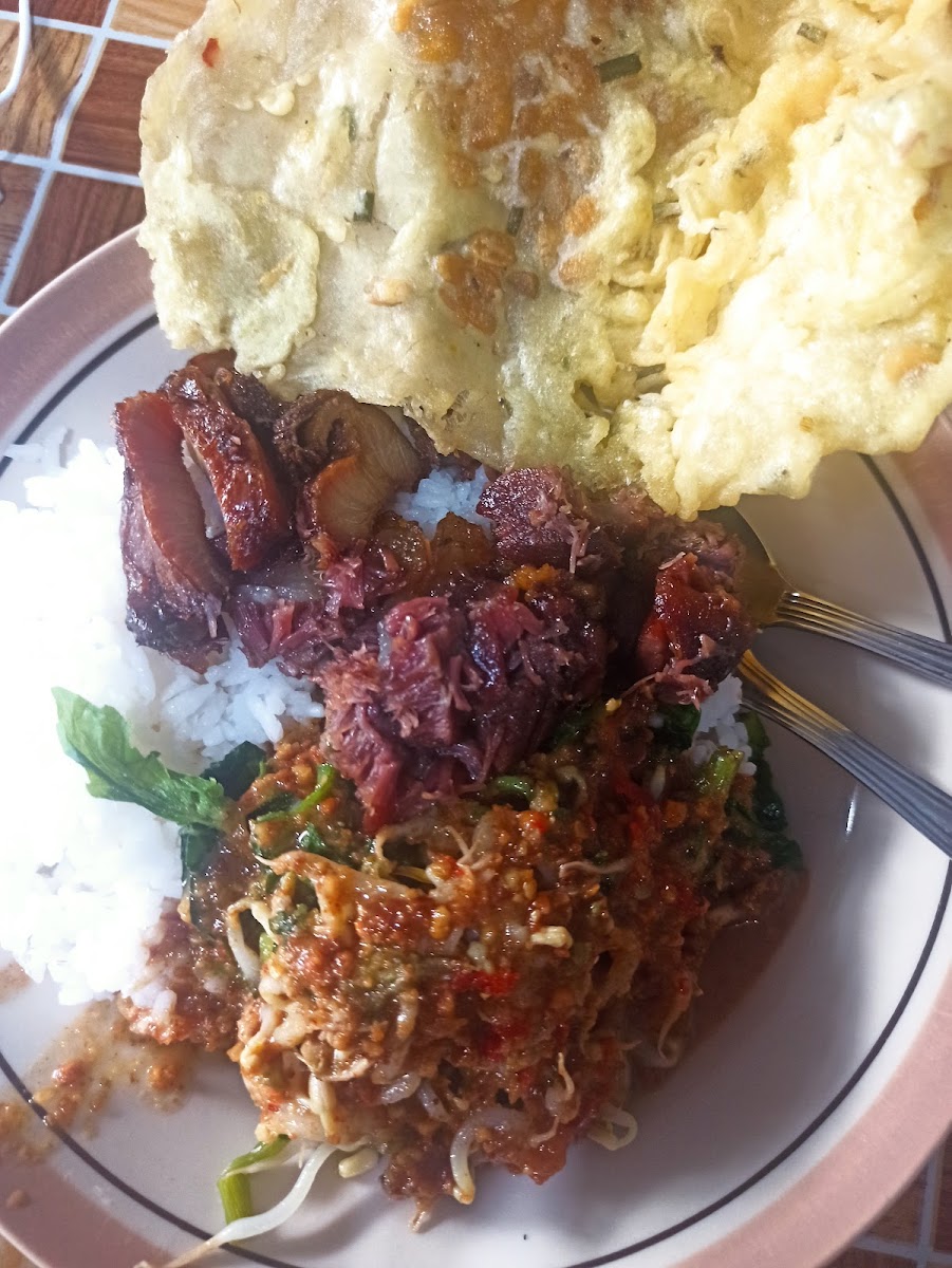 In addition to empal, you can indulge in their freshly made pecel, which showcases a creamy peanut sauce that is as aromatic as it is rich. What's particularly unique about their pecel is the use of local wild greens, like the daun kluban sawah, giving it a distinctly Wonosobo touch. The variety doesn't stop there; other delectable options include mie goreng (Javanese fried noodles), telur bumbu (spicy fried egg), babat goreng (marinated fried beef tripe), and a selection of stir-fried vegetables that add color and nutrition to your meal.